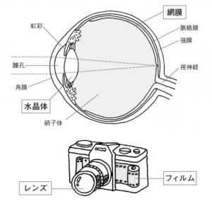 外から入ってきた光は「水晶体」を通って「網膜」に向かいます。